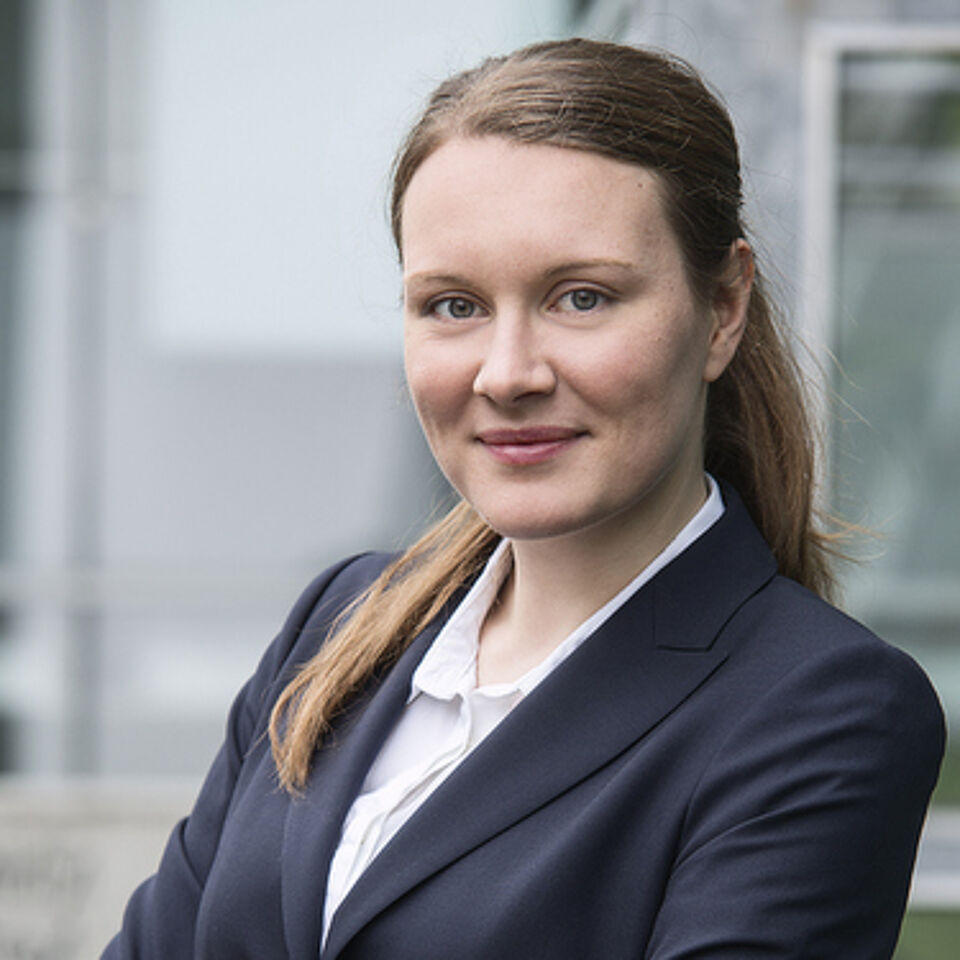 • Eine Frau mit kurzen Haaren, schwarzem Blazer und weißem Shirt